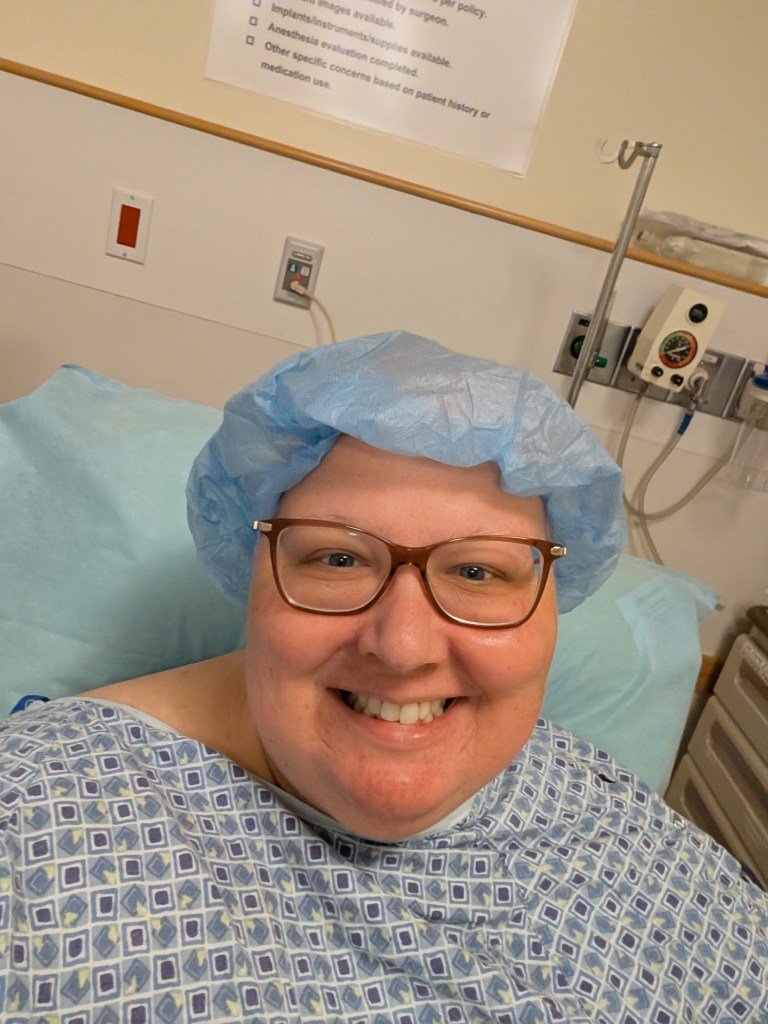 Yesterday morning, the radiologist did an ultrasound and mammogram and injected me with blue dye so they could see the lymph nodes coming from the tumor in my breast. About 5 hours later, I was moved into surgery. They gave me general anesthesia – my first experience with that. I didn’t feel scared until the last minute. I started crying as I went under. All of the emotions decided to come out and the last thing I remember were the surgical team reassuring me and me trying to redirect my focus on Jeff and my kids.
