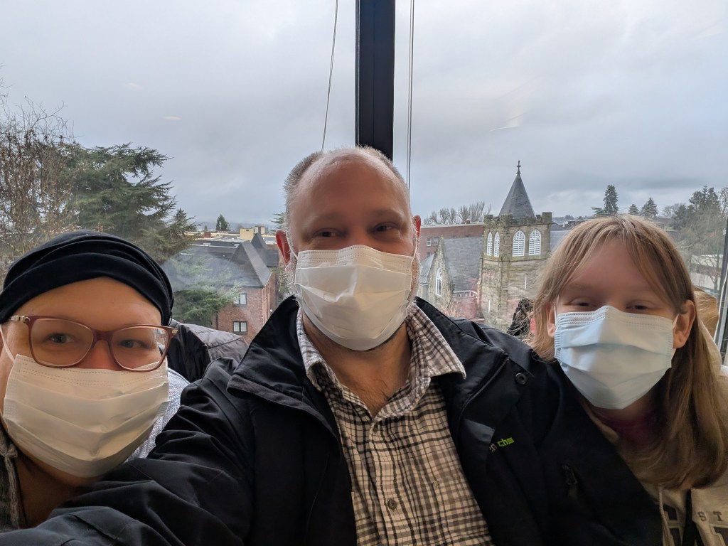 Our youngest is home from college and came with us to my treatment today. I made it past the halfway point and I started round 4 today. Two more to go!